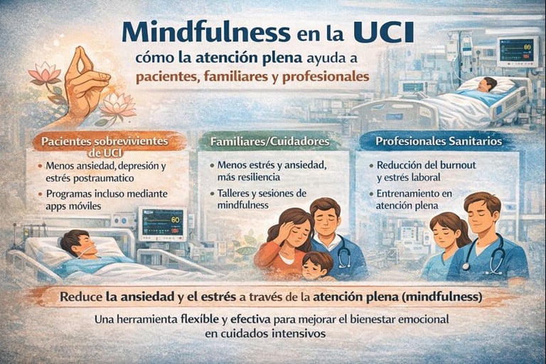 Los familiares suelen vivir la experiencia de la UCI con altos niveles de incertidumbre y miedo. Programas de mindfulness adaptados a cuidadores han demostrado disminuir la ansiedad y aumentar la resiliencia, ayudándoles a tomar decisiones con más claridad y a mantener un equilibrio emocional mientras apoyan al paciente.